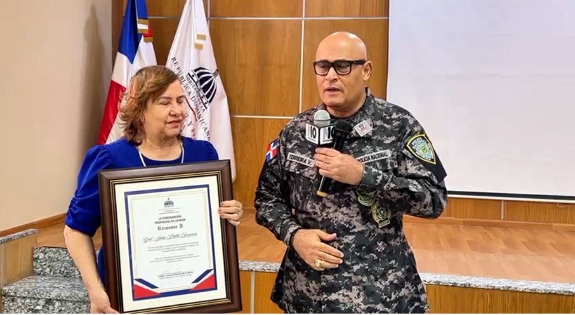 La Vega. – En un acto solemne realizado en el salón de conferencias de la Gobernación Provincial, la gobernadora Luisa Jiménez entregó un pergamino de reconocimiento al director regional de la Policía Nacional, general Juan Pablo Ferreira Vera, por su destacada labor en favor del mantenimiento de la seguridad ciudadana en esta demarcación.